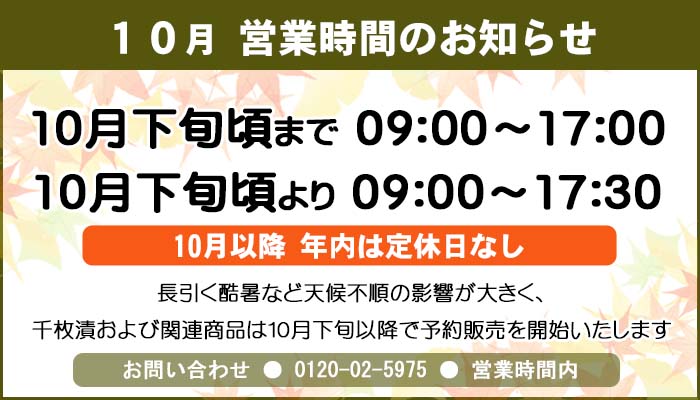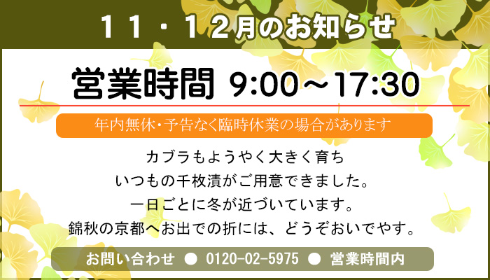 ■ 営業時間 別途ご確認ください ■ 定休日 ・ 4月 ~9月 水曜日 【7月31日棚卸につき休業】 ・10月~千枚漬期間 無休 【1月1・2日を除く】 ・ その他、臨時休業あり。その際にはご容赦ください。 ■ メールでのお問い合わせはこちら |