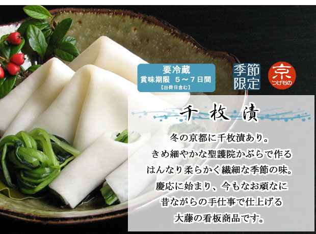 冬の醍醐味、千枚漬 ■ 本家の味を京都からお届け 千枚漬の名前のとおり、薄く切った聖護院かぶらを丹精込めて漬けました。 一子相伝、すべての味は5代目自ら仕上げてい…