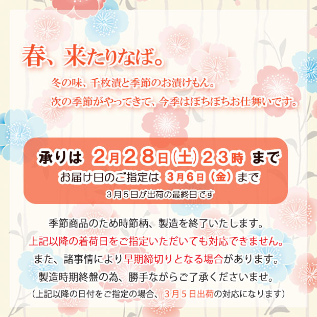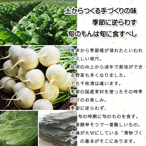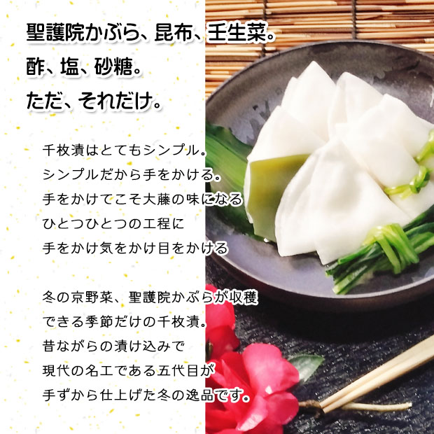 冬の醍醐味、千枚漬 ■ 本家の味を京都からお届け 千枚漬の名前のとおり、薄く切った聖護院かぶらを丹精込めて漬けました。 一子相伝、すべての味は5代目自ら仕上げています。 品のよい甘酸っぱさと昆布の風味が人気の逸品は 慶応元年の創業以来、大事に育てた当店の看板商品です。