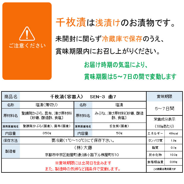 冬の醍醐味、千枚漬 ■ 本家の味を京都からお届け 千枚漬の名前のとおり、薄く切った聖護院かぶらを丹精込めて漬けました。 一子相伝、すべての味は5代目自ら仕上げています。 …