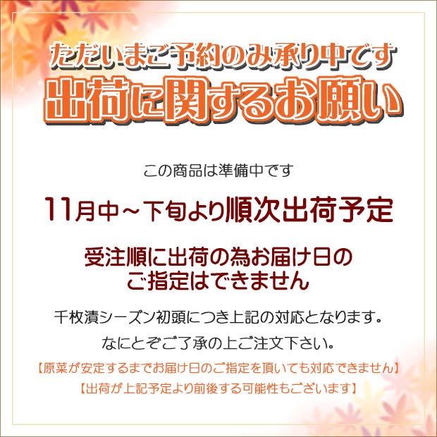 千枚漬の名前のとおり、薄く切った聖護院かぶらを丹精込めて漬けました。 一子相伝、すべての味は5代目自ら仕上げています。 品のよい甘酸っぱさと昆布の風味が人気の逸品は 慶応元年の創業以来、大事に育てた当店の看板商品です。