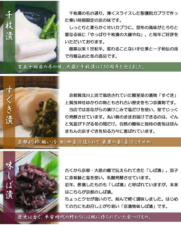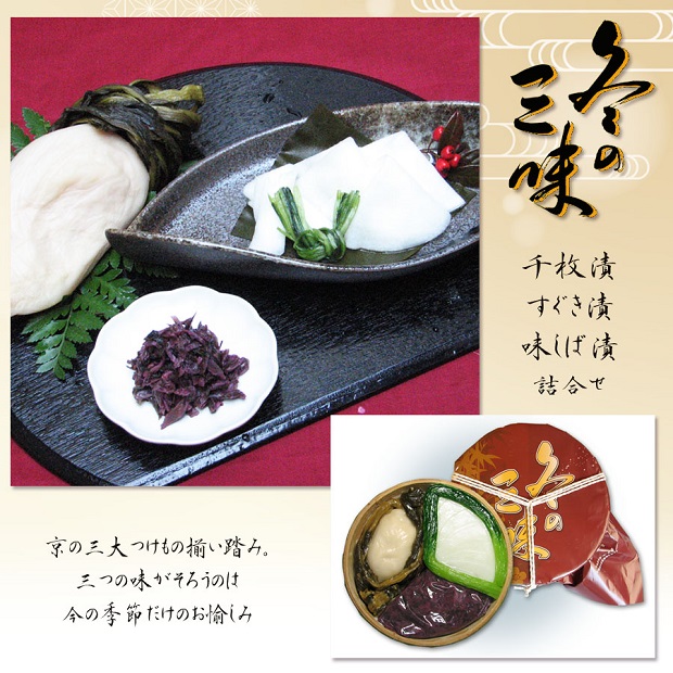 ◆ 冬の三味 ◆ 千枚漬・すぐき漬・味しば漬 詰合せ ◆ 京都からの冬だより。お歳暮・ギフトに人気です。 京の三大漬物、揃い踏み。 三…