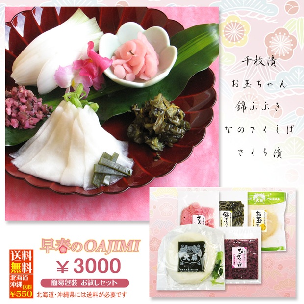 数多い京都の漬物から季節の味をチョイスし、お試しセットを作りました。 職人が吟味した、今の時期におすすめの自慢の味です。
